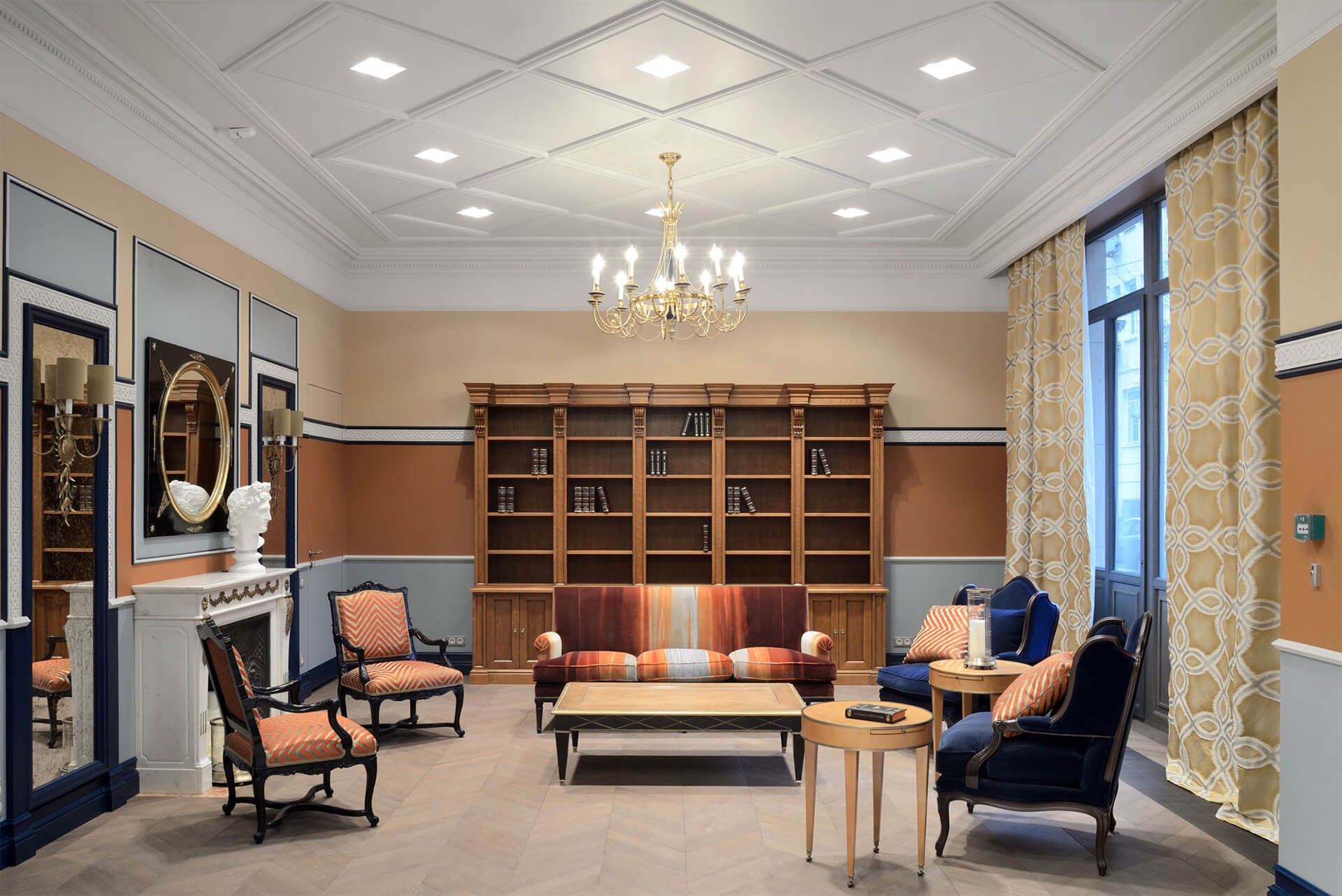 Входная группа дома «Булгаков» поражает своим величием и изяществом. Лобби оформлено с использованием французской мебели, старинного паркета и мраморных подоконников, создавая атмосферу роскоши и комфорта. Гипсовая лепнина и тщательно подобранные элементы декора отсылают к классическим парижским интерьерам XVIII-XIX веков, позволяя жильцам ощущать себя в центре европейской элегантности.